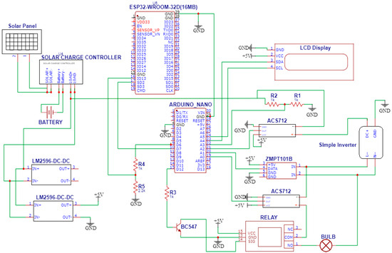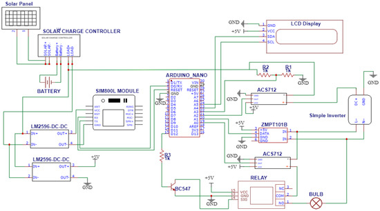Furthermore, a basic inverter is integrated to convert the DC to an AC, essential for the site’s location in Pakistan, where the standard operating voltage is a 220 V AC. A 5 V relay is connected to an Arduino through a transistor and resistor, along with a load to switch it on and off as needed. The Arduino operates on a 5-volt power supply, with all necessary sensors connected to it. To implement the design in EasyEDA, the project is initiated in the schematic editor. Subsequently, electronic components including the Arduino Nano, a ZMPT101B voltage sensor (Winsen Electronics Technology Co., Ltd., Zhengzhou, China), an ACS712 current sensor (Allegro MicroSystems, LLC, Manchester, NH, USA), resistors, a SIM800L GSM module, a 5 V relay, and a buck converter are selected from the extensive library and placed accordingly. Following component placement, connections are established between them using a wiring tool.