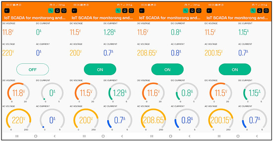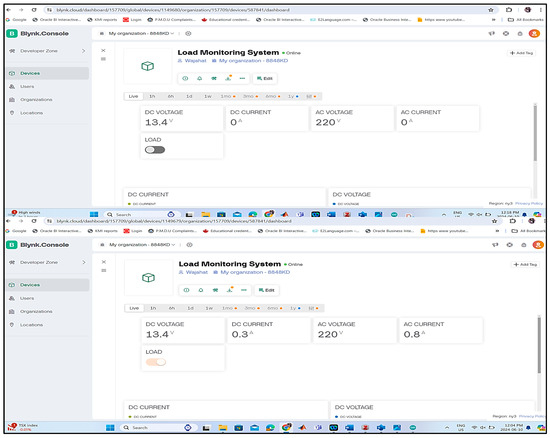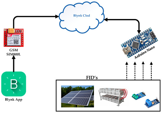Figure 9 depicts the Blynk app setup with the Arduino Nano and GSM SIM800L. Integrating Blynk enhances the PV system’s functionality and user experience by aggregating sensor data on the solar panel output and battery status. The data are transmitted to the Blynk app via Wi-Fi or GSM, enabling the real-time visualization and control of components via smartphones or tablets.