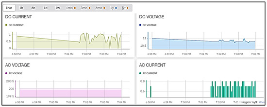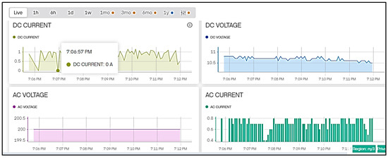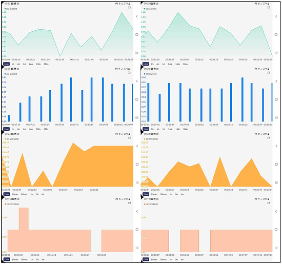 Figure 21 shows the status of the voltages and currents as a result of low PV exposure. These observations underline the sensitivity of the PV system to changes in environmental conditions, such as varying sunlight intensity. These fluctuations in both the DC voltage and DC demonstrate the dynamic nature of the system’s performance under less-than-optimal lighting conditions, providing valuable insights into how the system behaves in real-world scenarios.
