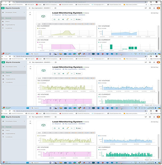 The ESP-32 receives the data from the Arduino Nano, processes them, and prepares them for transmission over the Wi-Fi network. Communication with the Blynk cloud server is established using HTTP protocols, enabling the ESP-32 to send FID data to the Blynk server, which updates the user interface on the Blynk console in real time. Control commands such as “ON” and “OFF” from the Blynk console are sent to the ESP-32, which then relays the commands to the Arduino Nano via the serial interface. The Blynk console displays real-time voltage and current readings of the PV panels, load, and battery, facilitating monitoring and control of the PV system and identifying anomalies.