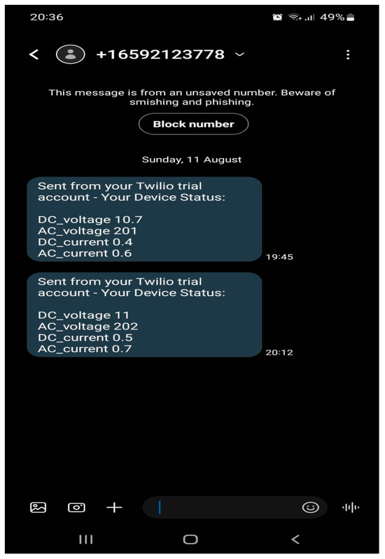 In addition to on-site monitoring, the system also supports remote notification via SMS, ensuring that users can stay informed about system performance even when they are away. This functionality is enabled through the integration of the Twilio platform, an open-source cloud communication service. Twilio’s robust Application Program Interface (API) allows for the seamless integration of messaging, voice, and video capabilities into applications. Specifically, within this SCADA system, Twilio’s SMS API is utilized to send real-time alerts regarding system status, faults, or operational changes directly to the user’s mobile phone, ensuring immediate awareness and a quick response. By incorporating Twilio’s services, the system significantly enhances its monitoring and communication capabilities, facilitating more responsive and efficient management of the PV system’s operational environment. Figure 22 shows the notification of system parameters via SMS under testing conditions.