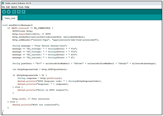 The sendTwilioMessage() function is designed to transmit an SMS containing critical electrical measurements—such as AC and DC voltage and AC and DC readings—to a specified phone number via the Twilio API. Initially, the function verifies the presence of an active WiFi connection; if WiFi is not connected, it exits and notifies the user via the serial monitor. If connected, the function proceeds by preparing the necessary components for message transmission. This includes constructing the Twilio API endpoint URL and encoding the account SID and authentication token for authorization. The electrical measurements are formatted into a clear and readable message, which is then embedded in the body of the HTTP POST request alongside the recipient’s and sender’s phone numbers. Upon sending the HTTP request to Twilio’s API, the function captures and outputs the response status code and content to the serial monitor, providing feedback on the success of the message transmission. If the WiFi connection is absent, the function immediately reports the issue without attempting to send the SMS. Figure 23 illustrates the Arduino IDE code implementation of the Twilio function.