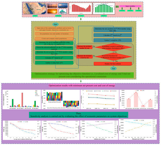represents the net present cost of the SPV module, represents the WT, represents the battery system, and represents the converter. The NPC for each component is a combination of capital (), replacement (), and operation and maintenance () expenses, as shown below: