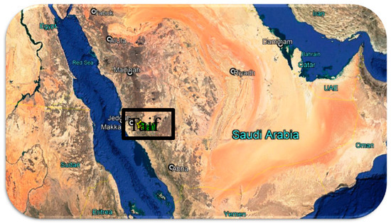 Saudi Arabia is located in southwestern Asia, surrounded to the eastern by the Arabian Gulf, which includes the United Arab Emirates, Bahrain, and Qatar, and to its west by the Red Sea. The country is fully inside the Sunbelt, spanning latitudes 31° N to 17.5° N. The average daily sunshine duration is 8.90 h, and solar irradiation ranges from 4.48 to 7.12 kWh/m2. In addition, the country’s annual average wind speed ranges from 6.2 to 8.1 m/s in most locations. These weather circumstances emphasize Saudi Arabia’s outstanding prospects for generating solar and wind energy. The present investigation centers on an on-grid site in Taif, Saudi Arabia, where an EV charging station is installed. The selected place is in Taif City, particularly at coordinates 21.2841° N, 40.4248° E, as shown in Figure 2.
