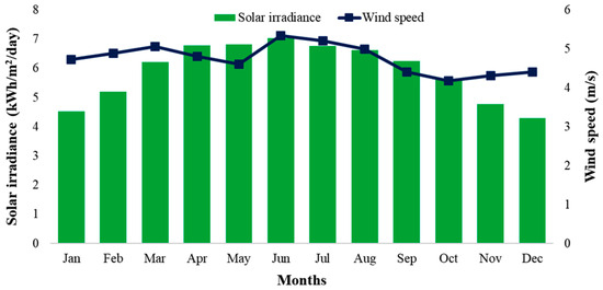 The western region of Saudi Arabia experiences hot weather for most months, with the country as a whole receiving an average solar energy of 2200 thermal kWh/m2 annually. This increases the western region’s potential for solar energy in comparison to other sections of the nation. Saudi Arabia has the ability to create renewable electricity from direct sunshine and photovoltaic cells. For the chosen site, worldwide horizontal sun irradiation data was retrieved from the NASA POWER dataset by supplying the geographic coordinates of the proposed EVCS position. The monthly mean variation in global horizontal solar irradiance is shown in Figure 3, with an annual average value of 5.905 kWh/m2/day. The graph indicates that solar radiation levels are higher from April to September, which corresponds to the extended summer season in the entire nation. The minimum and maximum radiation values are 4.283 kWh/m2/day in December and 7.023 kWh/m2/day in June, respectively. The WT is employed to convert the kinetic energy generated by blowing wind into electrical energy. It is crucial to accurately assess the wind power potential in Saudi Arabia to maximize electricity generation. Saudi Arabia’s huge land area of 2.15 million km2 provides great potential to create wind energy infrastructure, considerably contributing to the country’s 2030 growth plans. The strong winds in many places offer significant opportunities for renewable power generation and the development of small and huge-scale wind power plants. This may assist in saving traditional power supplies by replacing a considerable amount of the energy provided by fossil fuel burning with RESs. Previous research has shown that the western section of the country, encompassing the designated area for the proposed EV charging station, has greater prospects for wind power than other parts of the country. Wind data for the chosen location in western Saudi Arabia were obtained from the NASA Prediction of Worldwide Energy Resources (POWER) database and depicted in Figure 3. The monthly average wind speeds, recorded at 50 m above ground over a 30-year period, vary during the course of a year. The minimum and maximum wind speeds were measured in October and June, at 4.18 m/s and 5.34 m/s, respectively, with a 1 h autocorrelation factor of 85% during peak wind speed hours of 15 h. The average yearly wind speed is 4.745 m per second.