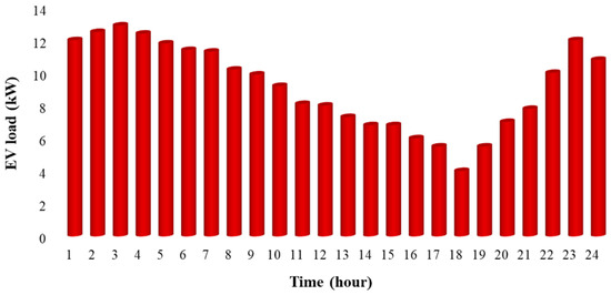 EVs are contemporary vehicles that run on electricity rather than petroleum or diesel. The use of EVs has grown in the past few years because of their important role in reducing the carbon content in the transportation industry. The EV battery’s charging capacity at hour t can be calculated using its maximum power rating [55].