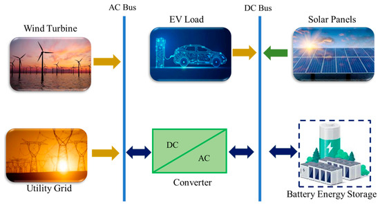 Furthermore, because RESs like sun and wind are intermittent, they frequently fluctuate. This unpredictability means that an electrical production system integrating RES components may lack the durability, security, and continuity of a system that does not include such components [6]. To ensure a continuous electricity supply, particularly for off-grid operations, a storage system must be introduced [7]. To address these challenges and efficiently utilize available RESs, integrating two or more of these resources into a combined electricity production system can effectively meet the charging demands of EVs. Using RESs reduces carbon emissions from conventional energy sources, thereby mitigating the impact of global warming. Currently, many solar photovoltaic (SPV)-based energy systems are used globally to power EV applications due to their well-understood operational paradigm. Additionally, wind energy is an appealing choice for generating power because it is more effective [8]. When paired with storage technologies such as batteries and SPV systems, wind power can offer a continuous, stable, and economical supply of electricity [9].