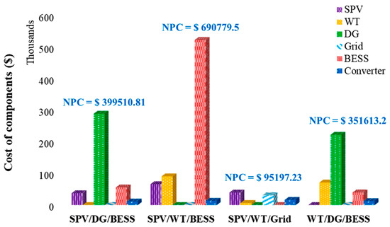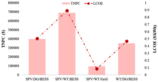 Total net present cost (TNPC) is the overall cost of an energy system throughout its life cycle, compensated for the time value of money. NPC considers all the expenses related with constructing, running, and preserving the energy system, as well as any money earned or savings accumulated during its lifetime [56].
