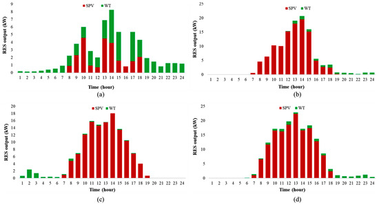 where represents the solar radiation on the inclined surface, denotes the beam radiation, is the diffuse radiation, is the geometric factor, signifies the ground reflectance, and is the tilt angle of the SPV module. The energy output of the SPV system is calculated using the solar radiation on the inclined surface and the attributes of the SPV module as detailed in [50].