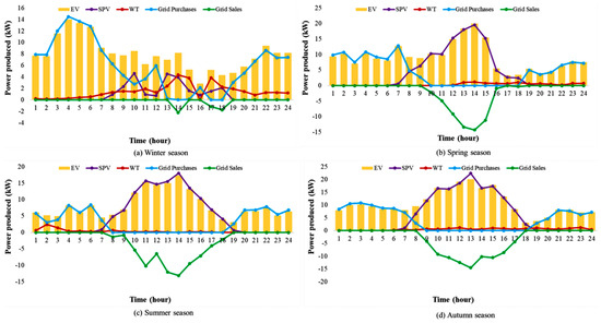 A critical aspect of optimizing energy resources and sizing system components is accurately modeling the energy requirements. The current hybrid system model is designed to meet the electric power needs of an EV charging station in a grid-connected mode. This hybrid charging station model, intended for the selected site, aims to compete with off-grid charging stations by minimizing costs, eliminating pollutant emissions, and enhancing efficiency. The Makkah Transportation Company’s primary workplaces and corporate headquarters are situated on this designated site. Having a small number of charging sites and EVs in Saudi Arabia, everyday charge demand is fairly predictable. For this research, a daily charge need of 10 kWh per electric vehicle is assumed, which powers an EV for about 160 km at 0.0625 kWh per kilometer. Given that the charging station installation site is around 40 km from Makkah’s city center, an EV can make two round trips each day. The EV load demand profile, including seasonal daily energy use, is depicted in Figure 4. The projected daily charge demand for at least 30 EVs is 300 kWh. The charging station will be operational throughout the day, with fewer EVs being charged between 3:00 p.m. and 7:00 p.m. Considering EV usage for 25 days per month, the average EV demand is calculated by integrating some variation for various days and months to provide a somewhat accurate yearly demand for this charging station.