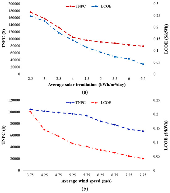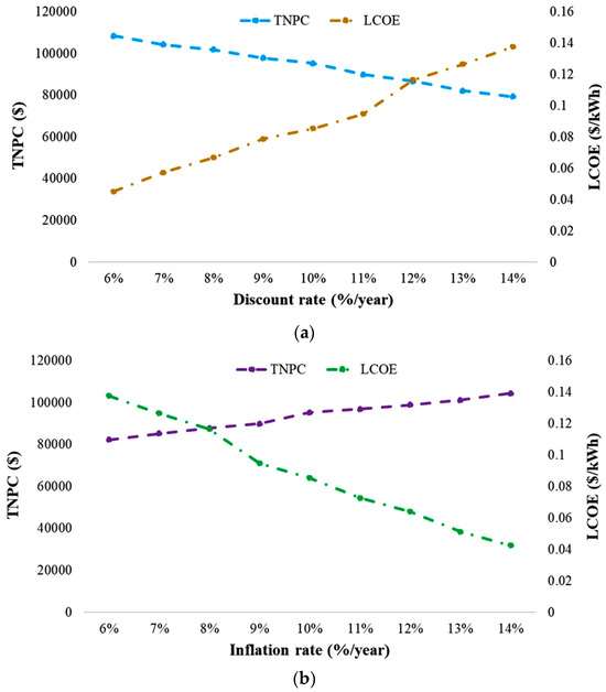 - Sensitivity analysis is used to investigate the effect of changing different input variables on the TNPC and LCOE. The impact on variations in sun irradiation, wind speed, inflation rate, and discount rate are investigated as well using sensitivity analysis.