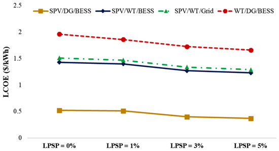 This section investigates the impact of varying LPSP levels on the LCOE across different configurations of energy system components. At an LPSP index of zero, the SPV/WT/grid configuration optimized by PFO achieves an LCOE of 0.0854 USD/kWh. This demonstrates a significant reduction compared to the TNPC values obtained for SPV/DG/BES, SPV/WT/BES, and WT/DG/BES configurations, as depicted in Figure 15, with reductions of 84.6%, 91.2%, and 82.2%, respectively. Increasing the LPSP to 1% from 0% decreases the LCOE of the SPV/WT/grid combination to 0.076 USD/kWh. This underscores the notable decrease in LCOE values with higher LPSP levels. Specifically, as the LPSP escalates from 1% to 3% and from 3% to 5%, the optimal LCOE of the SPV/WT/grid configuration decreases by 2.22% and 1.12%, respectively. A similar trend is observed for the reduction in LCOE values as LPSP levels increase across other system configurations.