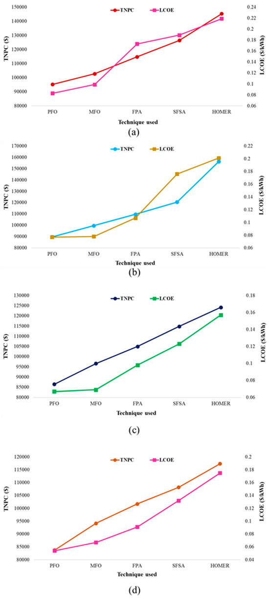 Similar to the preceding section, the effect of the LPSP variation on the LCOE and on the TNPC for the SPV/WT/grid system optimized using different optimization algorithms including PFO, MFO, FPA, SFSA and HOMER is investigated and plotted in Figure 16a–d. It can be observed from these figures that the tendencies of change in LCOE and TNPC are different and do not vary linearly with different levels of LPSP. However, the computational results indicate that an increase in LPSP values from zero to one percent results in a steady decrease in the LCOE and TNPC. The graph demonstrates that the optimized PFO approach consistently produces the lowest TNPC and LCOE across all LPSP values when compared to the MFO, FPA, SFSA and HOMER methods. Notably, at a 5% LPSP index, the PFO method achieves the lowest TNPC of USD 83765.71 and the lowest LCOE of 0.054 USD/kWh. The TNPC for the best PFO results ranges from USD 83765.71 to USD 95197.23, whereas LCOE varies between 0.054 USD/kWh and 0.083 USD/kWh, across the different LPSP levels. The findings also reveal that increasing the LPSP index percentage results in a reduction in both TNPC and LCOE for the optimal PFO outcomes as shown in Figure 16. Similar trends are observed for the other methods. Specifically, for the PFO system, the optimal LCOE decreases by 7.2%, 12.9%, and 19.4% as the LPSP increases from 0 to 1%, 1 to 2%, and 2 to 5%, respectively. Similarly, the optimal TNPC determined by PFO decreases by 6.1% as the LPSP index increases from 0 to 1%, whereas it decreases by 3.8%, and 3.2% as the LPSP index rises from 1 to 2%, and 2 to 5%, respectively.