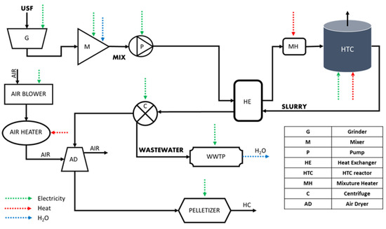 In this scheme, USF is first prepared to reduce and homogenize the particle size; then it is mixed with water to reach the desired DSW ratio. Downstream of the mixer, a pump raises the pressure to feed the slurry to the HTC continuous reactor, a regenerative heat exchanger (HE) preheats the slurry, while an external heater raises its temperature to the required level for HTC. From the HTC reactor, the slurry, containing HC and the aqueous products, and gases, formed during the reactions, exits. The exiting slurry is conveyed to a centrifuge, where liquid–solid separation is performed. The HC is transferred to an air dryer and is then pelletized, making it ready to be used as fuel. Before entering the centrifuge, the slurry passes through the regenerative HE mentioned above. External heating is required to raise the air temperature to the desired value. The liquid phase exiting the centrifuge is sent to a wastewater treatment plant (WWTP).