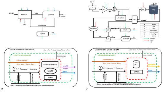 Schematic layouts and balance of TEC of USF treatment processes. (a) Case 0: biostabilization and landfilling. (b) Case 1: HTC process.