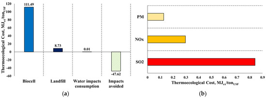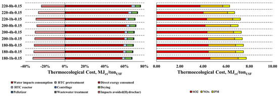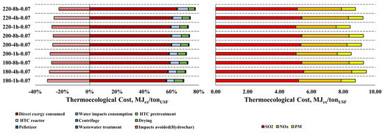 Regarding the TEC consumptions (electrical, thermal, water, chemical compounds, and HC produced) related to the processes analyzed, Figure 4 and Figure 5 show the specific results related to a ton of processed USF. As can be seen, the exergy content of the USF is the highest contributor. The TEC approach, in contrast to other environmental impact assessments, allows us to include this content in the analysis. The HTC process exhibited lower emissions compared to the base case. SO2 emissions were reduced to negligible levels, thereby minimizing the overall environmental impact. Apart from direct exergy consumption from USF, drying and reaction occurring during HTC have the highest consumption, as shown in Figure 4 and Figure 5. This is mainly because of high thermal and electrical energy consumption.
