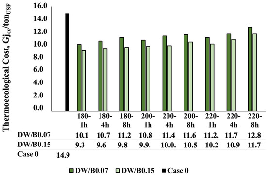 The results of the TEC analysis for the USF HTC process under various operational conditions are presented. The direct exergy consumption of USF and the exergy content of HC were calculated using Equations (2) and (3), with data presented in Table 2. The exergy content of waste and direct exergy consumption equaled 14,908 MJ/ton of USF.