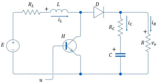 where represents the inductor current, is the inductance value, is the capacitance value, is the supply voltage, is the resistive value of the load, is the capacitor voltage, and represents the control input (logic “1” when the switch is open and logic “0” when the switch is closed). The state space that represents this analysis is presented in (2)