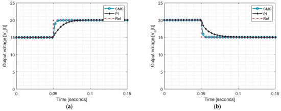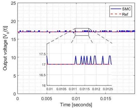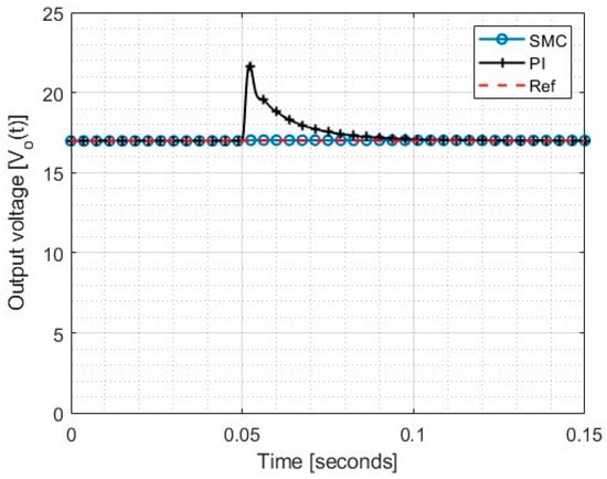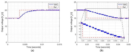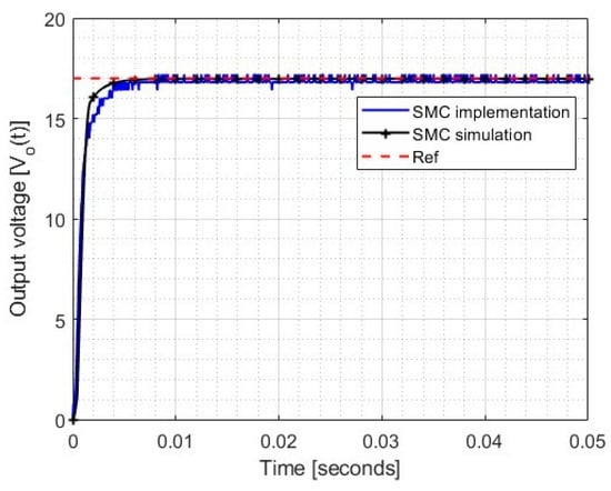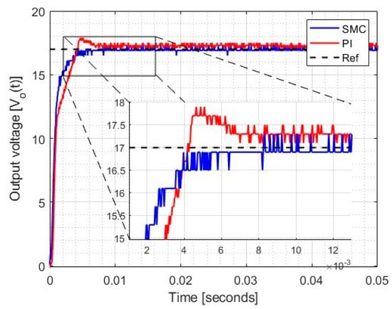 Although both controllers reach the voltage reference in an acceptable time according to the requirements, the SMC achieves it more quickly.