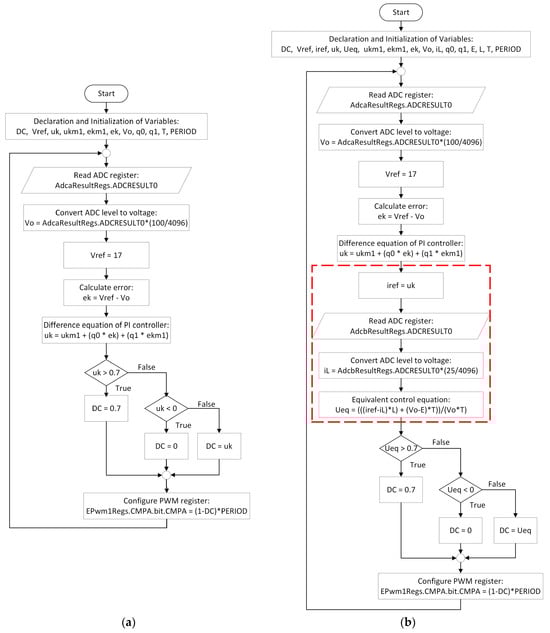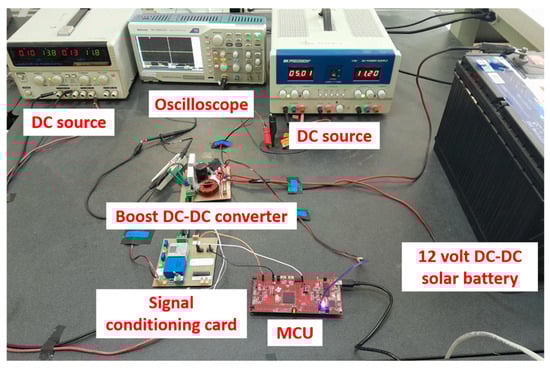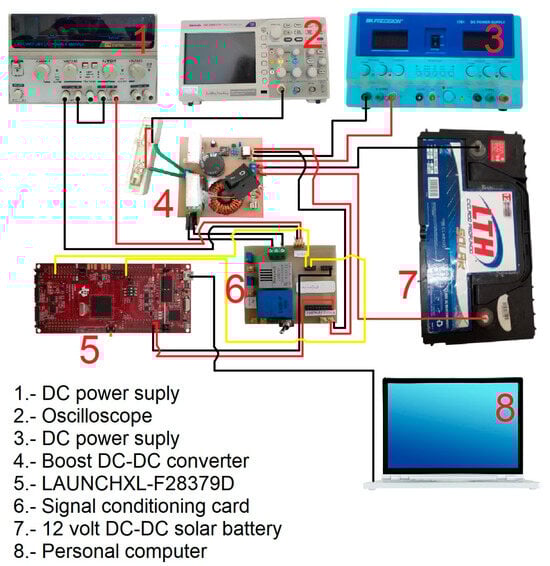 This implementation mainly consists of three devices: the MCU, which controls the converter’s output voltage through the implementation via software (compiled versions of C/C++ language) of the digital control algorithms previously described (PI and SMC); a signal-conditioning board with an LV25-P voltage sensor and a CSNE151 current sensor; and the prototype of the boost converter.