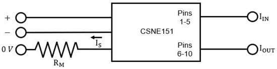 Ohm’s law is applied as shown in (25) to calculate . For this reason, a maximum input current of 25 A and a maximum output current of 25 mA are considered, according to the technical datasheet [].