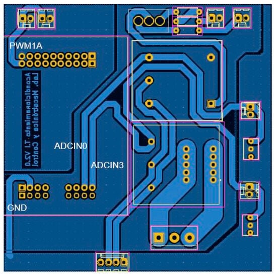In this work, two DC sources supplied power to the sensors and the converter’s MOSFET driver (MICREL INC acquired by Microchip Technology (San José, CA, USA)), while the oscilloscope was used as a data-acquisition system. Figure 6 illustrates the connection diagram for implementing both control systems.