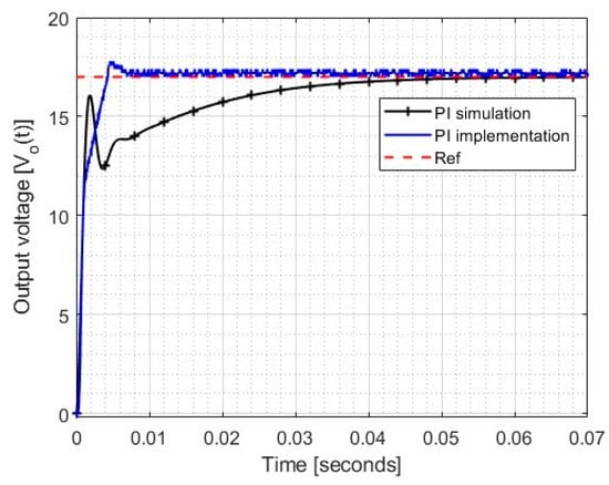 Figure 11 illustrates the response of the PI controller to a reference voltage of 17 volts, an input voltage of 12 volts through a solar battery, and a load of 120 . The graph shows both the response in simulation and implementation as a comparison between them.