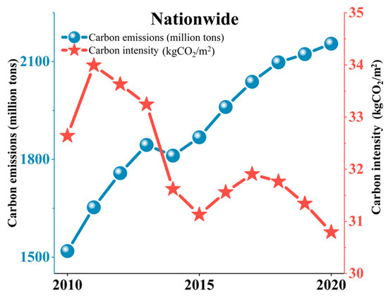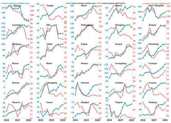 Additionally, China’s CI has shown a downward trend overall, continuously decreasing from 34 kgCO2/m2 in 2011 to 31 kgCO2/m2 in 2015, and between 2015 and 2020, it essentially remained between 31 and 32 kgCO2/m2. This is attributed to the increasingly prominent position and role of ecological civilization construction in China on the eve of the 18th National Congress of the Communist Party of China [43]. During this period, policies for energy-efficiency improvement and emission control measures have achieved significant results. China has vigorously promoted energy-saving building materials, green building standards, and building energy-saving technologies, which may have led to a reduction in carbon emissions per unit area of buildings. Moreover, related research indicates that the level of local property services will also effectively impact CI [61]. It is also known from Figure 2 that, between 2010 and 2020, the CI of the 30 provinces fluctuated significantly, with most provinces showing a downward trend to some extent or essentially remaining unchanged. This is due to the implementation of related energy-saving policies. The “12th Five-Year Plan for Energy Conservation in Buildings”, “Green Building Action Plan”, and “13th Five-Year Plan for Energy Conservation and Green Building Development” policies mainly include the following measures: (1) renovation of buildings in the centralized heating areas of the north (Liaoning, Jilin, and Heilongjiang) and (2) energy-saving renovations of buildings in hot summer and cold winter regions (Shanghai, Chongqing, Gansu, Guangxi, etc.).