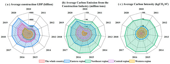 Combining the analysis of parts (a) and (b) of Figure 3, except for the northeast region, the development trends of CECI and the GDP of the construction industry in other regions are basically proportional. The more developed the economy, the higher the CECI, and vice versa. However, the CECI in the northeast region is significantly higher than the national average and the other three regions. From part (c) of Figure 3, it is known that the CI in the western region is only second to the northeast and eastern regions, while the average GDP of the construction industry and CECI in the western region have long been ranked last. This should further consider different regional climate conditions, industrial structures, energy structures, and building areas.