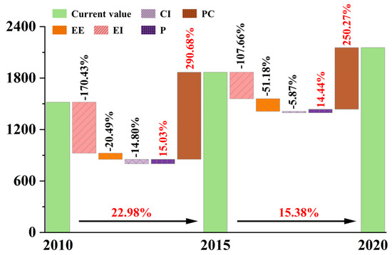 According to the data from 2015 to 2020, the driving forces of the five factors have decreased by about 1–60% compared to the period from 2010 to 2015. This is somewhat related to the reduction in carbon-emission growth. Moreover, as the policies and technologies of the earlier period have been gradually implemented, these driving factors have already achieved certain effects in promoting the decarbonization of the construction industry [39]. To achieve stronger emission reduction effects in the later stages, it is necessary to face higher costs and technical difficulties, and the marginal benefits are gradually decreasing. Among them, the promotional effect of PC on CECI has decreased by about 40%, which is closely related to the shift of our country’s economic development model from high speed to high quality.