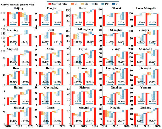 After clarifying the changes in provincial CECI and CI, this study further examined the driving factors for five CECIs. As can be seen from Figure 4, between 2010 and 2020, PC (population change) made the largest contribution to the growth of CECI, followed by P (policy). EI (emission intensity) made the largest contribution to emission reduction for CECI, with EE (energy efficiency) and CI (carbon intensity) ranking second and third, respectively.