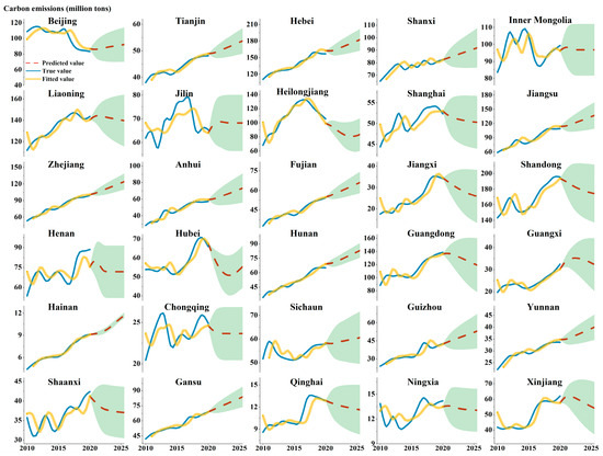 Based on the CECI data of various provinces from 2010 to 2020, the optimal ARIMA models for different provinces were selected step by step using Stata 16 software to forecast the CECI trends from 2021 to 2025. The results are shown in Figure 6.