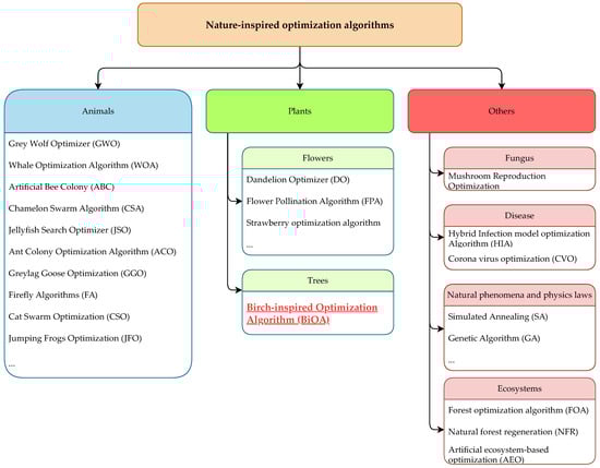 - Kumar, A.; Nadeem, M.; Banka, H. Nature inspired optimization algorithms: A comprehensive overview. Evol. Syst. 2023, 14, 141–156. [Google Scholar] [CrossRef]