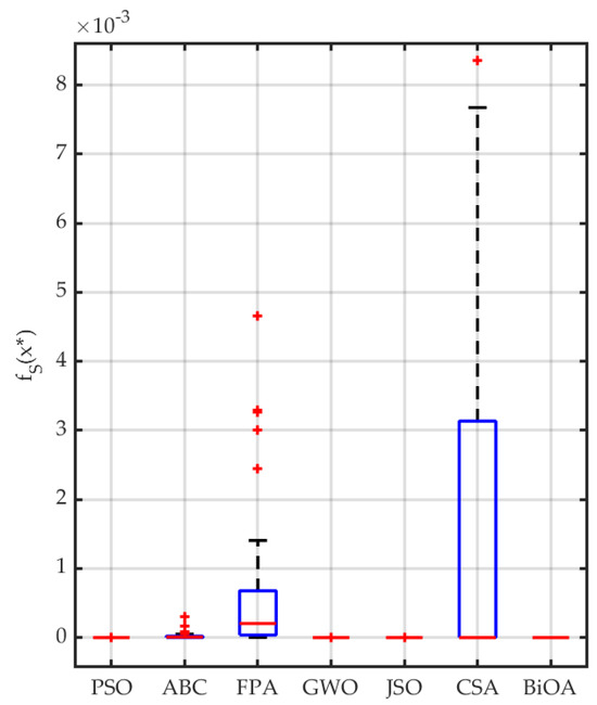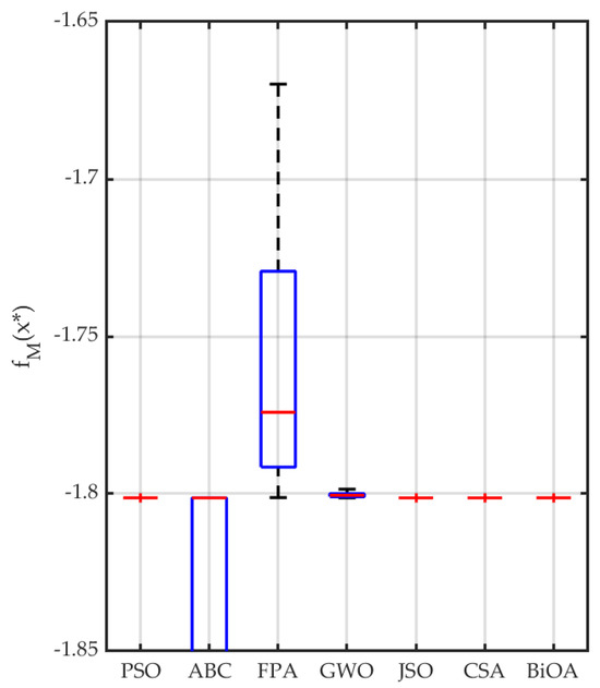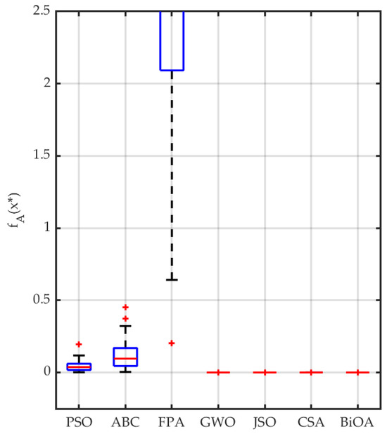 - The developed BiOA resulted in a very high precision in convergence toward the global minimum. This is caused by the parameters decreasing with the next iterations. Thus, it was observed that the BiOA was able to achieve results with even accuracy. None of the compared algorithms was characterized by such perfect results.