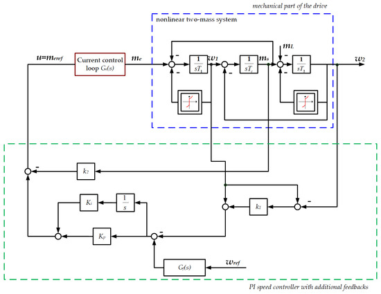 - In order to effectively dampen torsional vibrations with an elastic connection, one of the advanced control structures should be used. In the present study, a system with a PI controller and additional couplings from the torsional torque and speed difference between the working motor and the load machine was chosen. For a system with known and fixed parameters, it is possible to use the pole placement method to select the parameters of the control system and achieve the assumed pole location of the closed system. This provides the desired trajectories of closed-loop system state variables in the linear range of operation.