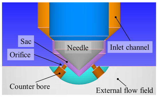The parameters of the five nozzles with different values of wall inclination angles are shown in Table 3. The nozzles are all equipped with two symmetrical injection holes (with the same sizes), and angles ω are equal, i.e., ωin = ωout = 90°. The injection holes of all nozzle models exhibit a cylindrical layout with equal modulus and opposite directions of left- and right-side wall inclination angles, specifically φin = −φout. The dimensions of the injection hole (hole diameter D = 0.16 mm, hole length L = 0.2 mm, counter bore diameter Dc = 0.4 mm and counter bore length Lc = 0.4 mm) are fixed for the five nozzles. Nozzle Na is used as a reference in the comparative analysis, and its wall inclination angles are φin = φout = 0°, while the injection hole inlet cross-section of the other nozzles is normally biased, with a right-side wall inclination angle φout < 0° and a left-side wall inclination angle φin > 0°, keeping φin = −φout (cylindrical hole). For this series of nozzles, when φin = −φout ≠ 0°, the normal direction of the orifice inlet cross-section deviates from the injection hole-axis.