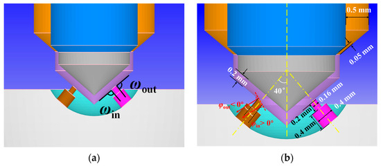 The nozzle geometry is shown in Figure 2. As illustrated in Figure 2a for one of the injection holes (on the right in the picture), the inlet angle ω, which is related to the cone angle, separates the sac wall from that of the orifice. With reference to the right injection hole in the picture, the “left-side” wall indicates the hole wall that is closer to the needle axis, while the “right-side” wall refers to the wall of the hole further away from the needle axis. Specifically, the left-included angle ωin separates the sac wall from the orifice left-side wall, and the right-inlet-included angle, ωout, separates the sac wall from the right-side orifice wall. The inclination angles between the orifice walls and the direction oriented along the normal injection hole inlet section are evidenced in Figure 2b; the wall inclination angle between the normal section moving out from the orifice inlet cross-section area and the “left-side” injection hole wall is defined as φin (positive when clockwise), whereas the angle between the abovementioned normal and the “right-side” injection hole wall is labeled as φout (positive when counterclockwise). The injection hole cone angle φ0 is given by the angle included by the extension lines of the left-side and right-side walls of the orifice, and has a definite geometric relationship with the wall inclination angle, namely φ0 = φin + φout. Hence, φ0 = 0° denotes a cylindrical hole.