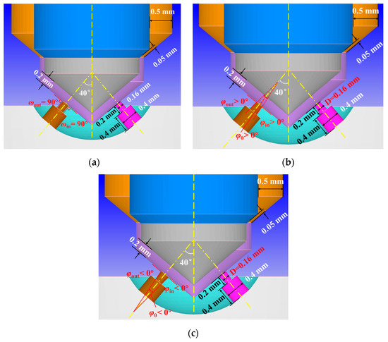 Schematic structure of the nozzle geometry model with different orifice cone angles. (a) cylindrical orifice φ0 = 0°; (b) divergent orifice φ0 > 0°; (c) convergent orifice φ0 < 0°.
