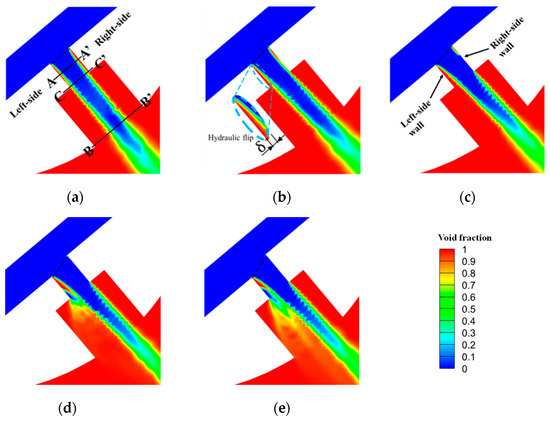 Void fraction contours of orifice axial cross-section at different wall inclination angles φ. (a) Nozzle Na: φin = φout = 0°; (b) Nozzle Nb: φin = −φout = 5°; (c) Nozzle Nc: φin = −φout = 10°; (d) Nozzle Nd: φin = −φout = 15°; (e) Nozzle Ne: φin = −φout = 20°.