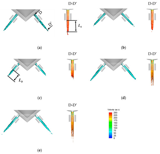 As shown in Figure 8, for comparison of the liquid core morphology between nozzles with different wall inclination angles φ, the D-D′ plane is the observation cross-section through the orifice axis. The variation in liquid core breakup length Lb with the wall inclination angle φ for each nozzle is shown in Figure 9. As φ increases, the cavitation intensity on the orifice’s left side, shown in Figure 8, intensifies, leading to an intensified gas phase. Simultaneously, the instability wave on the surface of the fuel jet gradually amplifies, leading to a reduction in the breakup length of the liquid core. As the φ surpasses 10°, the fuel in the liquid phase inside the orifice is pushed towards the right-side wall (cf. also Figure 5). The fuel jet progressively forms a semi-annular, hollow and unenclosed liquid core for the nozzles Nd and Ne. The liquid core extends and stretches on both sides of the axial cross-section of the nozzle, leading to an increase in the liquid core length Lb, with a rise in φ. In other words, the gas phase compresses the liquid core to make thickness smaller (cf. Figure 4), then the liquid core length increases.