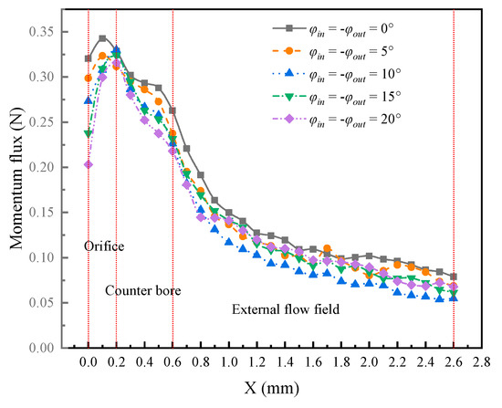 The variation of the momentum flux of the fuel jet along the axial position of the orifice for different wall inclination angles φ is shown in Figure 11, where coordinate X gives the direction of the injection hole axis. The momentum flux increases and then decreases along the axial position of the injection hole and reaches its maximum value inside the orifice, where the effective flow area of the orifice is at its minimum.