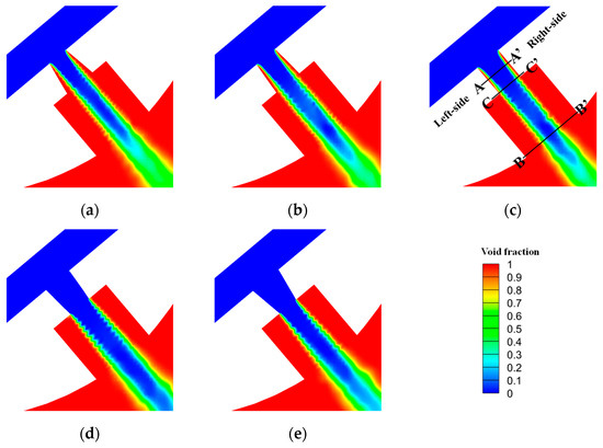 Void fraction contours of orifice axial cross-section at different orifice cone angles φ0. (a) Nozzle N1: φ0 = +20°; (b) Nozzle N2: φ0 = +10°; (c) Nozzle N3: φ0 = 0°; (d) Nozzle N4: φ0 = −10°; (e) Nozzle N5: φ0 = −20°.