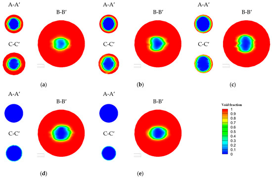 In order to further examine the influence of the wall inclination angle on the flow and cavitation characteristics within the injection hole, a comparative analysis was conducted on the contours depicting the gas volume distribution. These void fraction contours were generated for the central cross-section A-A′ of the orifice, the exit cross-section C-C′ of the orifice and the exit cross-section B-B′ of the counterbore, as illustrated in Figure 4a. The obtained results are presented in Figure 5. By combining Figure 4 and Figure 5, it is evident that when φin = φout = 0°, the cavitation phenomena in the 2D picture occur on both sides of the wall region of the orifice. The cavitation region extends towards the exit of the orifice, allowing downstream environment gases to enter the orifice along its wall surface; an annular gas layer is formed. During this phase, the fuel flow characteristics within the orifice can be classified as hydraulic flip [19]. Moreover, at the cross-section B-B′ of the counterbore exit, the liquid-phase fuel jet exhibits an elliptical shape, and this can be ascribed to the slight cavitation asymmetry that can be noticed in Figure 5a (cross-sections A-A′ and C-C′).