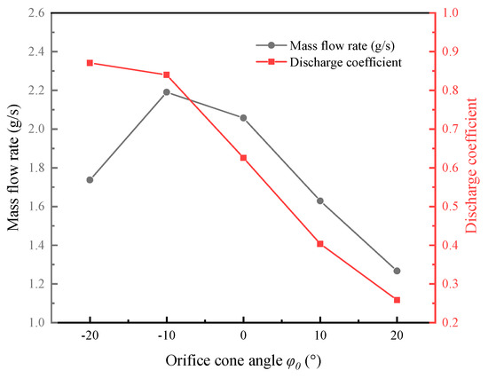Mass flow rate and cavitation asymmetry of orifice at different orifice cone angles φ0.