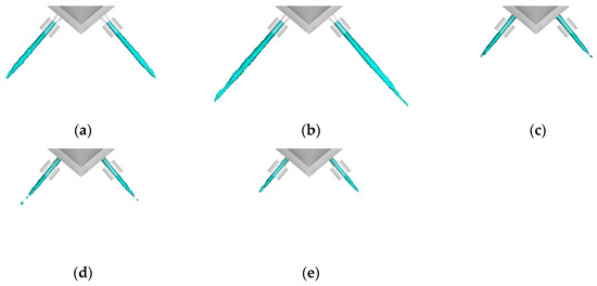 As φ increases further to φin = −φout = 15° or 20°, the cavitation phenomena on the right side of the spray orifice disappear (cf. 2D images in Figure 4d,e). Consequently, the liquid-phase fuel comes into direct contact with the wall of the orifice, forming a turbulent boundary-layer flow. Simultaneously, the strong cavitation region formed on the orifice side, closer to the needle axis, intensifies and perturbs the liquid-phase fuel. This perturbation causes the gas-liquid interface to stretch and distort, leading to an unstable hydraulic flip. As a result, the fuel reattaches to the wall at almost half of the orifice axial length [55]. During this phase, the cross-section of the fuel jet continues to exhibit a crescent-shaped liquid core. Moreover, the degree of distortion on the jet surface increases, leading to an expanded contact area with the downstream environment gas. This change in the morphology of the liquid core, resulting from the alteration in the internal flow state, contributes to the breakup of the liquid core. Consequently, it enhances the atomization effect of the fuel jet.