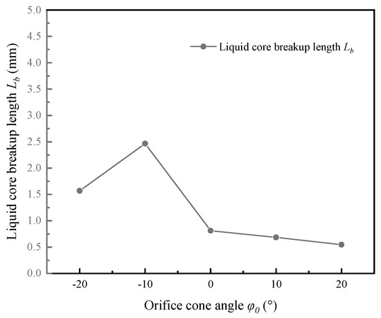 Figure 16 and Figure 17 show the variation of the liquid core morphology and liquid breakup length of the fuel jet for nozzles with different angles φ0, respectively. The liquid core breakup length of the divergent orifice (φ0 > 0°) is smaller than that of the cylindrical orifice. In fact, as φ0 increases, the cavitation intensity inside the orifice increases and the gas-liquid interactions are enhanced, resulting in the growth of the instability wave on the surface of the fuel jet, which contributes to the liquid core breakup.
