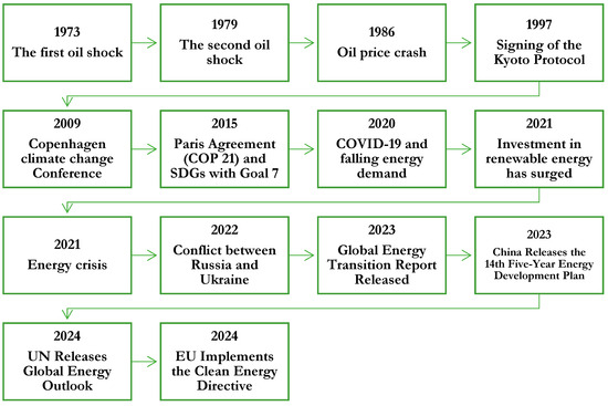 As shown in Figure 1, the decline in oil prices in 1986 marked a pivotal shift, diminishing OPEC’s influence over oil pricing and significantly impacting the global energy market and political economy. The Kyoto Protocol in 1997, the Copenhagen Climate Change Conference in 2009, and the Paris Agreement in 2015 collectively underscored the international commitment to addressing the environmental impacts of energy consumption and advancing renewable energy development. The COVID-19 pandemic in 2020 highlighted vulnerabilities in the global energy supply chain, while the subsequent surge in renewable energy investment signaled a shift towards sustainable energy sources. The 2022 Russian–Ukrainian conflict further exposed energy security concerns, prompting accelerated efforts for energy diversification. Recent initiatives, including the IRENA’s “Global Energy Transition Report”, China’s 14th Five-Year Plan, the United Nations’ “Global Energy Outlook”, and the European Union’s “Clean Energy Directive”, reflect the global focus on renewable energy development, technological innovation, and sustainable energy policies.