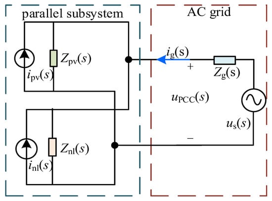 According to the impedance equivalent method of the AC system [18], Figure 1 can be equivalent to the small signal model shown in Figure 2, where ipv, inl, Zpv, and Znl are the equivalent current sources and impedances of the inverter and the nonlinear load, respectively. The stability of the system depends on whether Zg(s)/[Zpv(s) || Znl(s)] satisfies the Nyquist stability criterion if the PV generation unit and the nonlinear load are stable under an ideal voltage source. For the convenience of the later description, the system in which the PV generation unit is connected in parallel with the nonlinear load is referred to as a parallel subsystem. The impedance of the parallel subsystem is as follows: