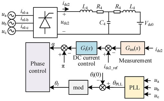 The circuit topology and control system structure of the nonlinear load based on three-phase controllable rectification are shown in Figure 3. In Figure 3, the PLL is the same as the phase-locked loop in reference [19] with proportional and integral coefficients of kp3 and ki3, respectively; Gim(s) is the gain and first-order filtering loop used for the DC current measurement; Gi(s) is a Proportion-Integral (PI) controller for DC current control, with proportional and integral coefficients of kp4 and ki4; idc_ref is the reference value of the DC current; θl(0) is the phase lag of the l-th switch; θl is the phase angle of the equivalent grid voltage; and α is the trigger angle.