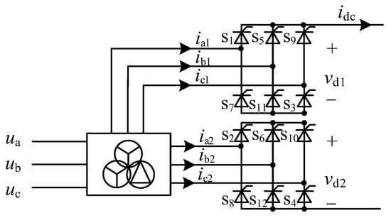 To reduce the harmonics introduced by the front-end rectifier, a 12-pulse rectifier is used for the controllable nonlinear load, of which the specific structure of the rectifier is shown in Figure 4.